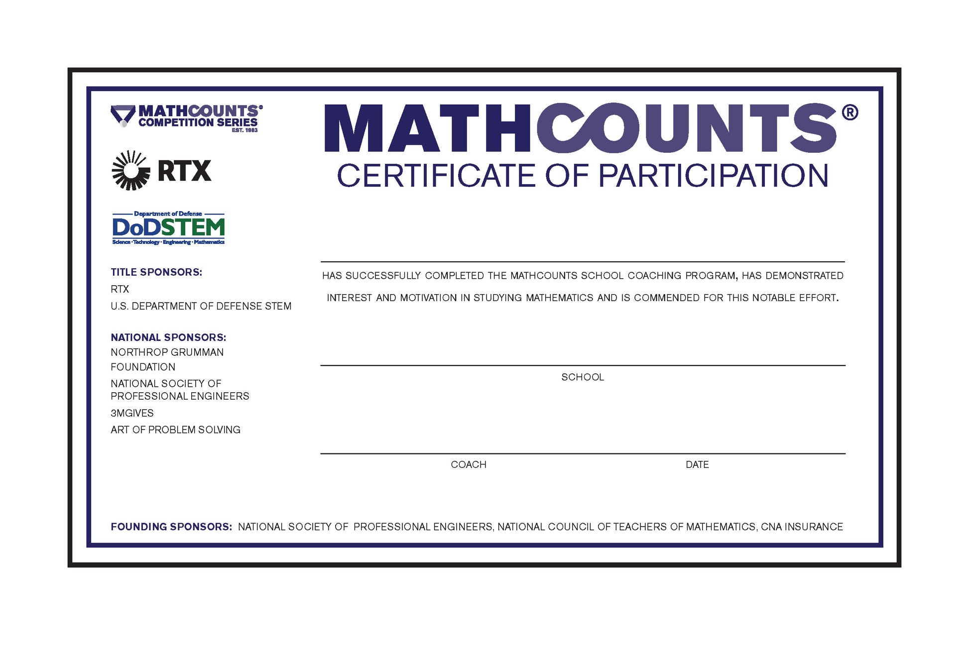 Copy reads: "_________ has successfully completed the coaching program of this school; has demonstrated interest and motivation in the study of mathematics; and is commended for this notable effort."